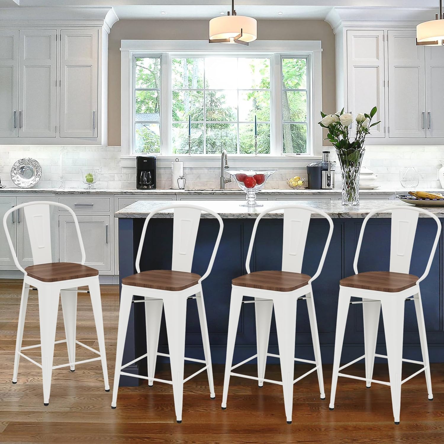 Features:Material: Scratch and mar resistant steel. Color: As the picture shown. (Due to the different resolution of the computer monitor, there will be some color difference.) Sturdy Metal Chairs Set of 4, a cross brace underneath the seat adds extra stability and features plastic caps that prevent the finish from scratching when stacked. Non mar rubber feet prevent from sliding and scratching floors, the metal frame is solid, you are not worry about the safety. These Tabouret counter height stools come fully assembled, and are stackable (Need to remove the backrest to be able to stack) ; making them easy to transport and store. Stylish modern metal chairs ideal for kitchen, dorm, shop and bar, all around bistro, patio, cafe, restaurants, home and restaurant or any occasion. Modern industrial style goes well with your kitchen bar. The use of advanced electrostatic spraying equipment, can effectively rust proof, durable. For longevity, care should be taken to protect from long periods of wet weather. Package included:4 x bar stools