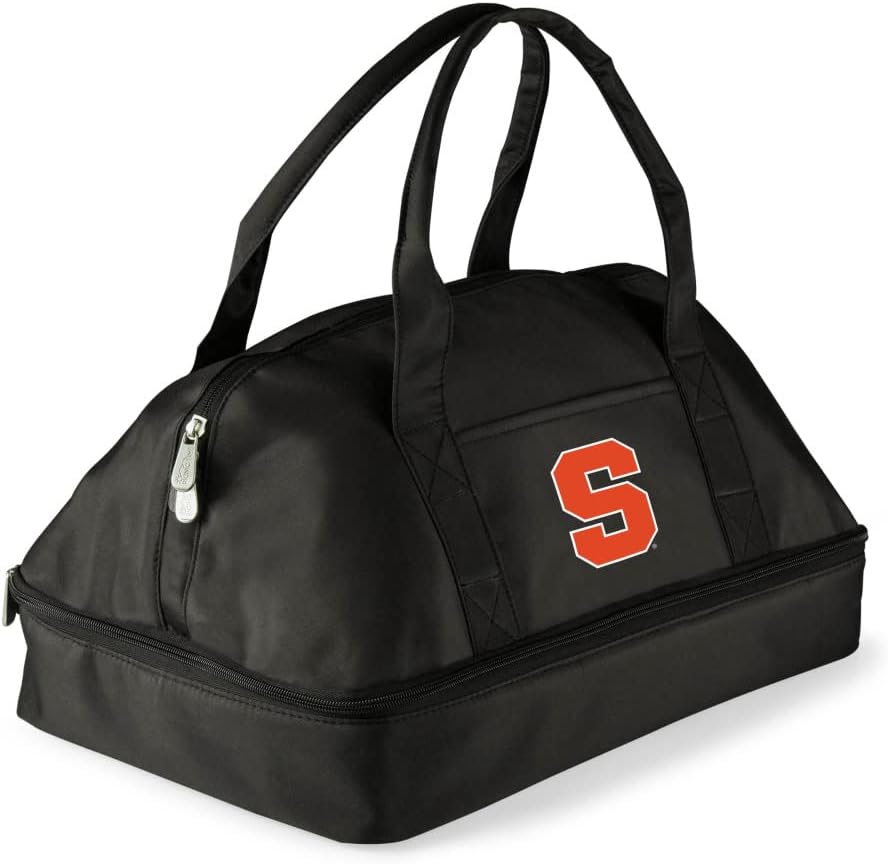Perfect for game day gatherings, this Picnic Time NCAA Potluck casserole carrier features durable polyester microfiber construction, and a handy two-tiered design. The base section is an insulated compartment made to carry warm items up to 300 degrees Fahrenheit, or will also transport cold foods, while a separate zippered entry section on top can be used for shelf-stable foods, utensils, or personal items. Handles at the back have built-in elastic loops to hold one large serving utensil. Your favorite team's digital print logo is positioned on the front of this handy carrier, and a framed window slot and ID card will help to insure your Potluck will make its way back to your kitchen. Measures 16.5 by 10.75 by 7 inches.