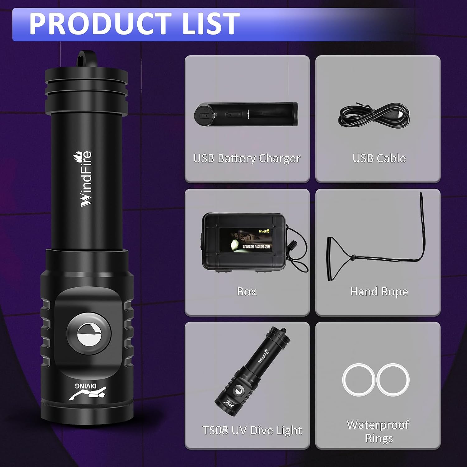 | Included Components | 1 x WindFire TS08 395 nm UV Dive Light, Lanyard, Usb Cable |
